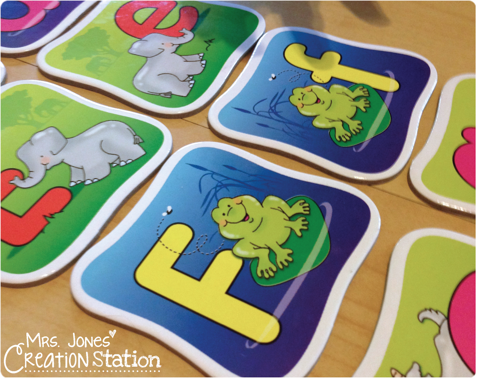 First, we played Letter Hunt together. I hid the letter cards upside down around our playroom. As Grayson found them we said the name of each letter and the picture and placed the cards on the table (we did not say the letter sound because my primary goal is for him to identify the letters easily). Once all of the letters were found we matched each letter in the capital and lowercase form.